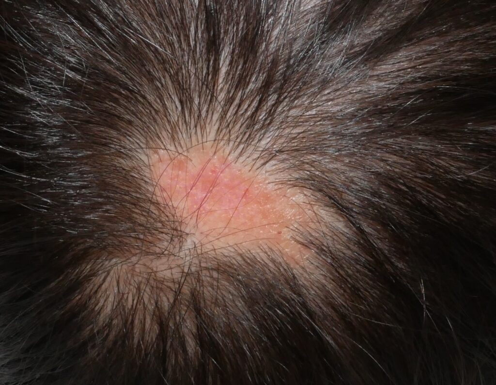 頭部に生じた脂腺母斑。毛髪が欠如し、淡黄色調を呈する。成長とともに隆起性となることが多い。